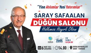 Tekirdağ Büyükşehir Belediyesi olarak il genelinde önemli yatırımları hayata geçirmeye devam ettiklerini belirten Tekirdağ Büyükşehir Belediye Başkanı Kadir Albayrak, “Yapımı tamamlanan Safaalan Düğün Salonu Projemizin açılışını yapacak olmanın mutluluğunu yaşıyoruz. Bu tesisimiz uzun yıllar boyunca halkımıza hizmet verecektir. Cumhuriyetimizin 100. yılında yüz yılın yatırımlarını Tekirdağ’a kazandırıyoruz. Sosyal, kültürel, sportif ve ulaşım alanında önemli projeleri hayata geçiriyoruz. Safaalan Düğün Salonumuzun hayırlı olmasını diliyor, vatandaşlarımızı açılış törenimizde bizlerle birlikte olmaya davet ediyorum” dedi.
