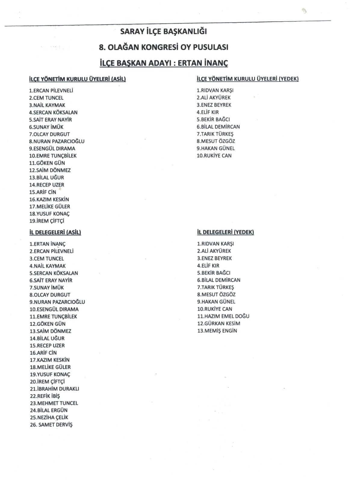 19 Ekim 2024’te Türkiye Sanayi ve Teknoloji Bakanı Mehmet Fatih Kacır’ında katılımıyla gerçekleşen AK Parti 8. Olağan Saray İlçe Kongresine tek liste olarak giren AK Parti Saray İlçe Başkanı Ertan İnanç bugün yönetim kurulu üyeleriyle birlikte ilçe seçim kurulundan mazbatasını teslim aldı.